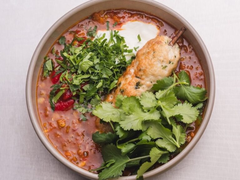 Суп з шматочками сома, броколі, шпинату, карі та рибним соусом з кінзою і лаймом