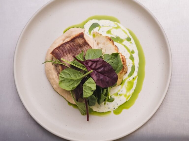 Запечене філе сома, смажена цвітна капуста, пюре з цвітної капусти, мікс салату, зелена олія з петрушкою та соусом з кафіру