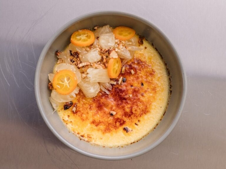 Ніжний запечений заварний крем з філе помело, слайсами кумквата та кешью - кафіром
