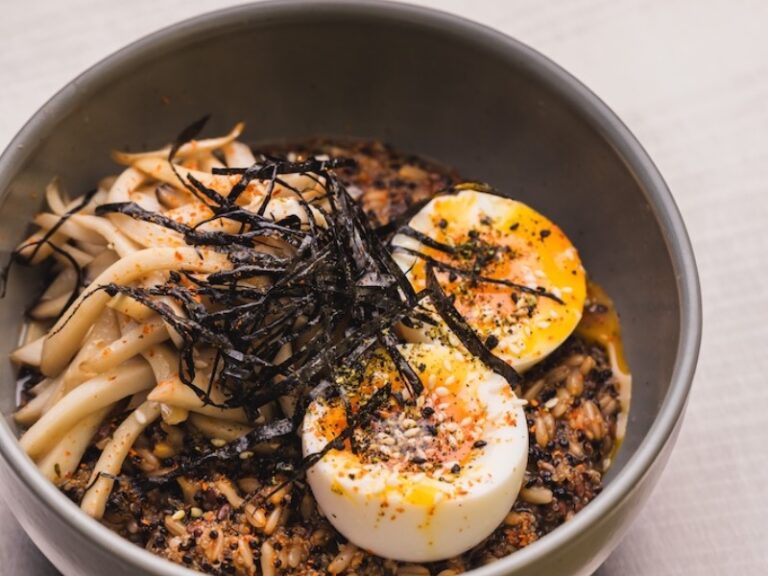 Льон, вівсянка, амарант та кіноа відварені у бульйоні з білих грибів з місо пастою та смаженими ерінгами, додаємо яйця та норі