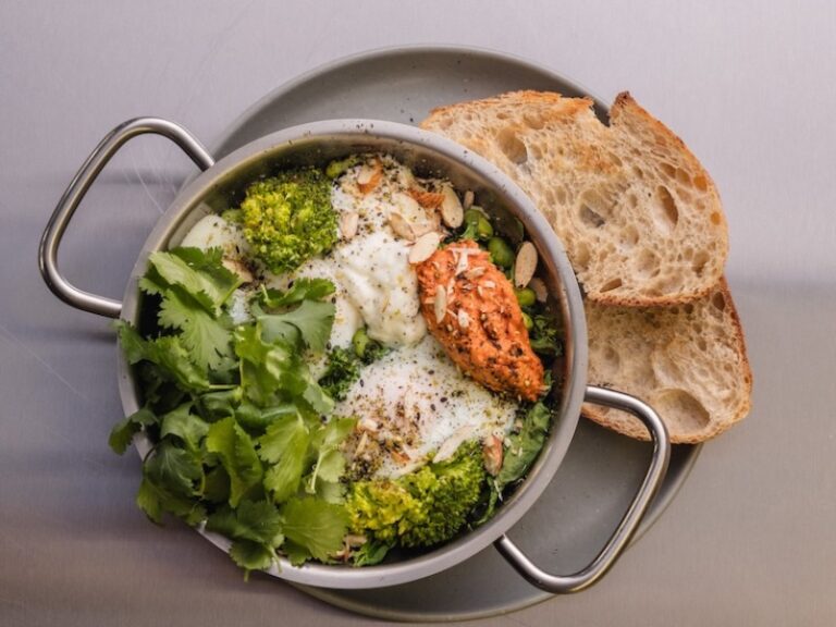 Яйце пашот на подушці із цукіні, форель конфі, зі шпинатом та кімчі, подаємо з соусом Голландез