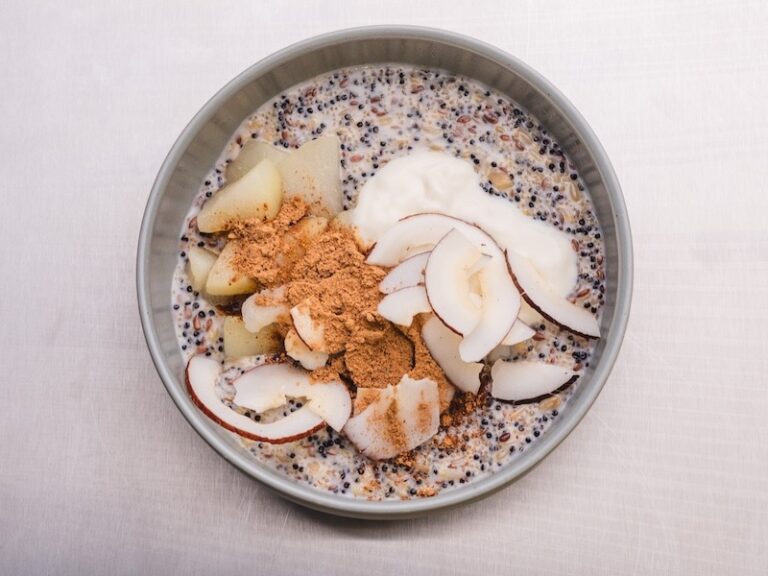 Мультизлакова каша з чотирьох злаків (льон, амарант, вівсянка, кіноа) на основі кокосових вершків, подаємо з кокосовими чіпсами, грушою та корицею