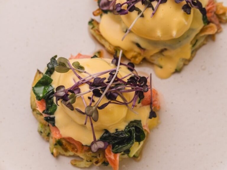 Бенедикт оладки з цукіні, форель конфі і соус з жовтка