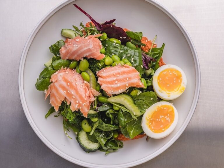 Мікс салату, селера, гострий соус Мухамара із червоного перцю, боби едамаме, яйце, лосось конфі, огірок, броколі