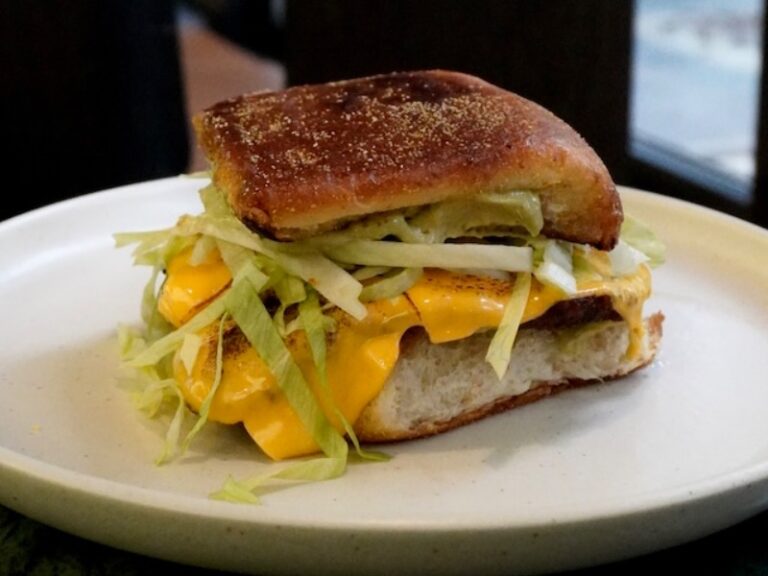 Мафін з котлетою з сому, сиром Чедер, айсбергом, томатом та майонезом карі