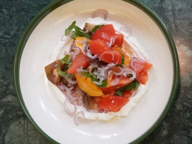 Літній салат з трьома сезонними томатами (рожевий, кумато та жовтий) з мусом з фети та свіжим базиліком, подаємо із цибулею (але можем прибрати, тільки…