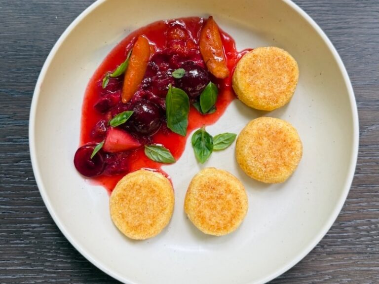 Ніжні сирники без додавання цукру з соусом із сезонних свіжих ягід - полуниця, черешня, абрикос.