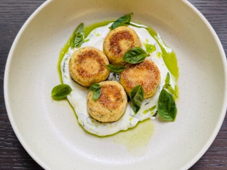 Ніжні солоні сирники з кропом, на подушці із муса Фети, зеленим маслом та базиліком