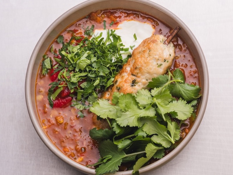 Мароканський суп з сочевиці, кебаб з сому, турецьким йогуртом, свіжою кінзою та джемом з печених перців