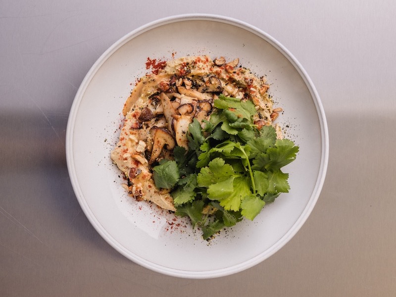Хумус з тахіні та додаванням обсмажених грибів ерінгі і шиїтаке в соєвому соусі з цедрою лимона, посипаний міксом горіхів і кінзою